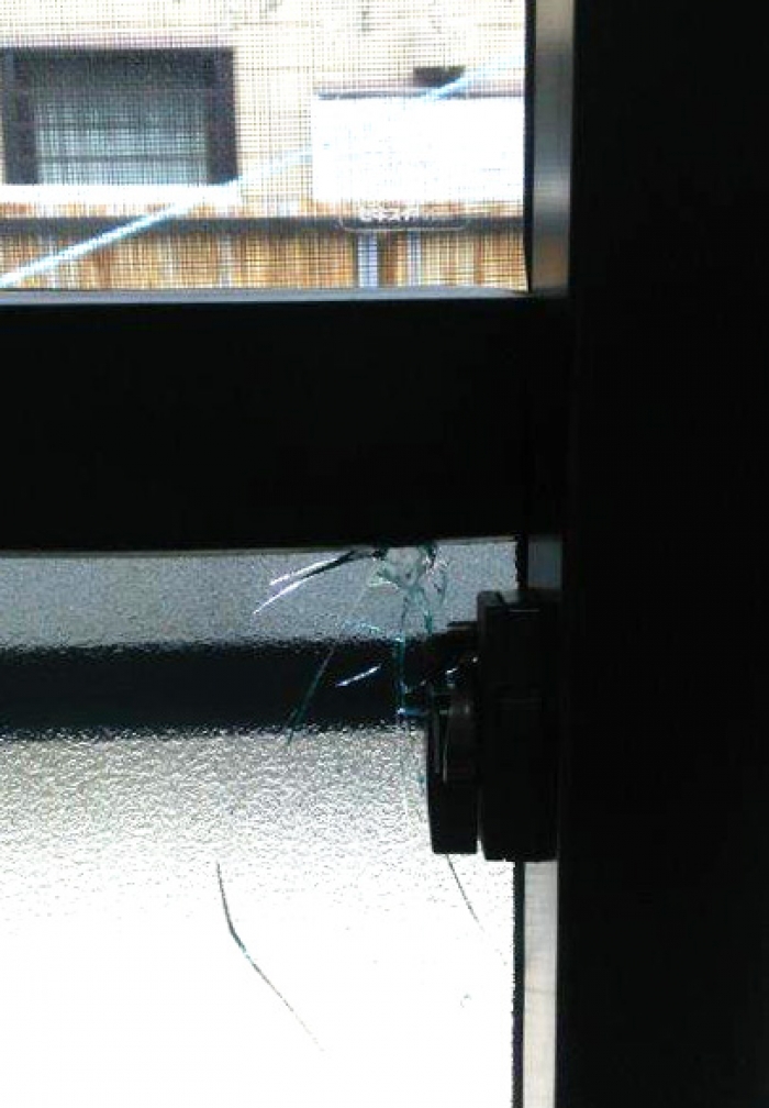ドロボウにガラスを割られてしまったということで現場に行きました。